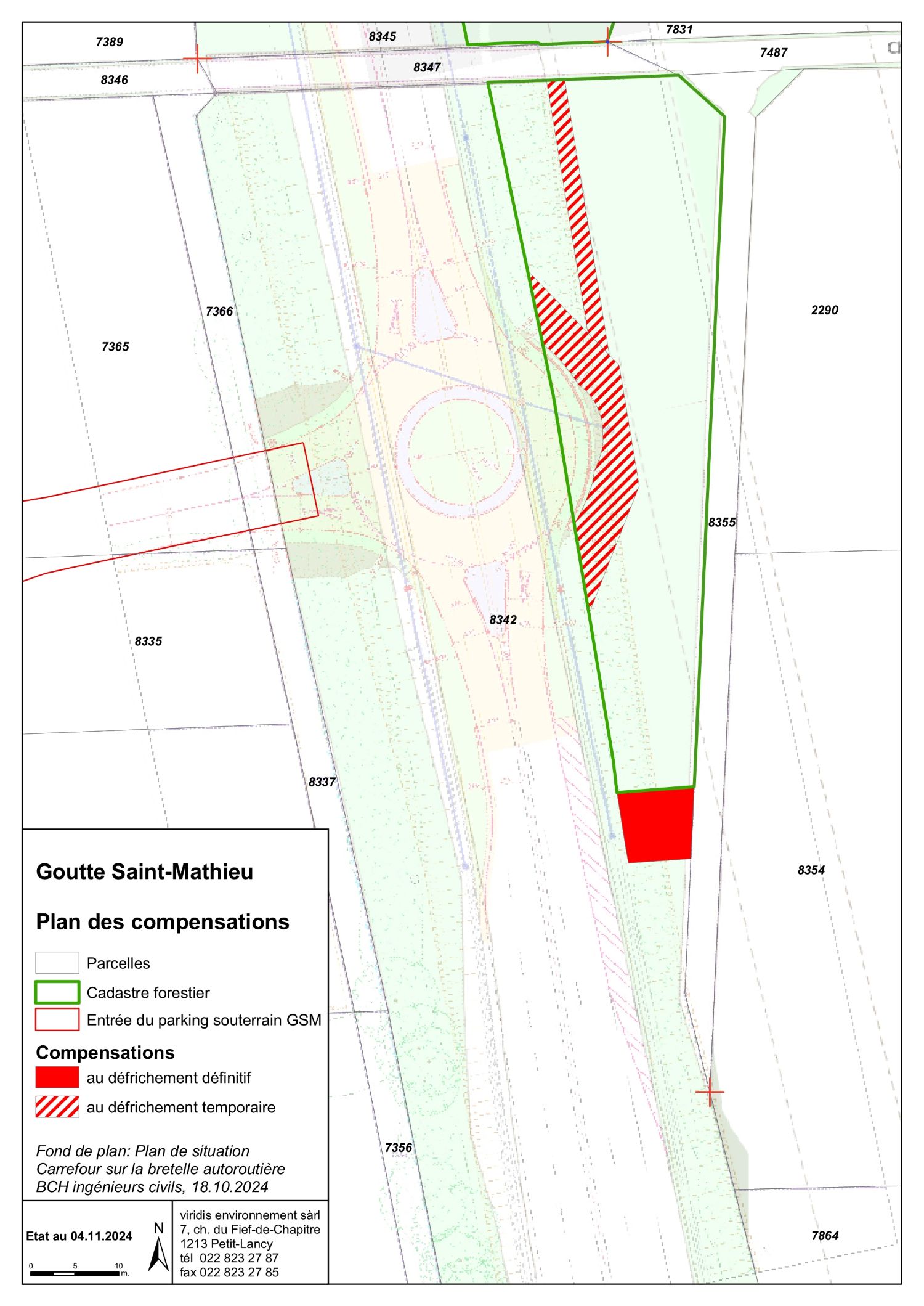 L’accès routier au site est effectué depuis la bretelle autoroutière de Bernex. Cela nécessite la réalisation d’un rond-point au droit de ce nouvel embranchement, qui cause un élargissement des emprises routières au niveau de l’entrée dans le site sur une surface inscrite au cadastre forestier.