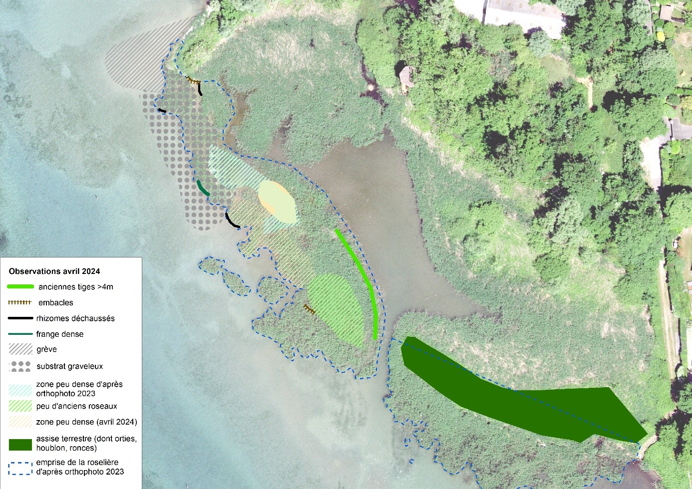 L’objectif de cette étude est de vérifier, sur la base des données existantes et de relevés de terrains ponctuels, quelles dynamiques régissent aujourd’hui la vitalité de la roselière, quels facteurs (clapot, déchets flottants, courants et sédiments) peuvent influencer la végétation et en particulier la dégrader, afin de pouvoir ensuite proposer des mesures d’amélioration des conditions, voire d’agrandissement de la roselière lacustre.